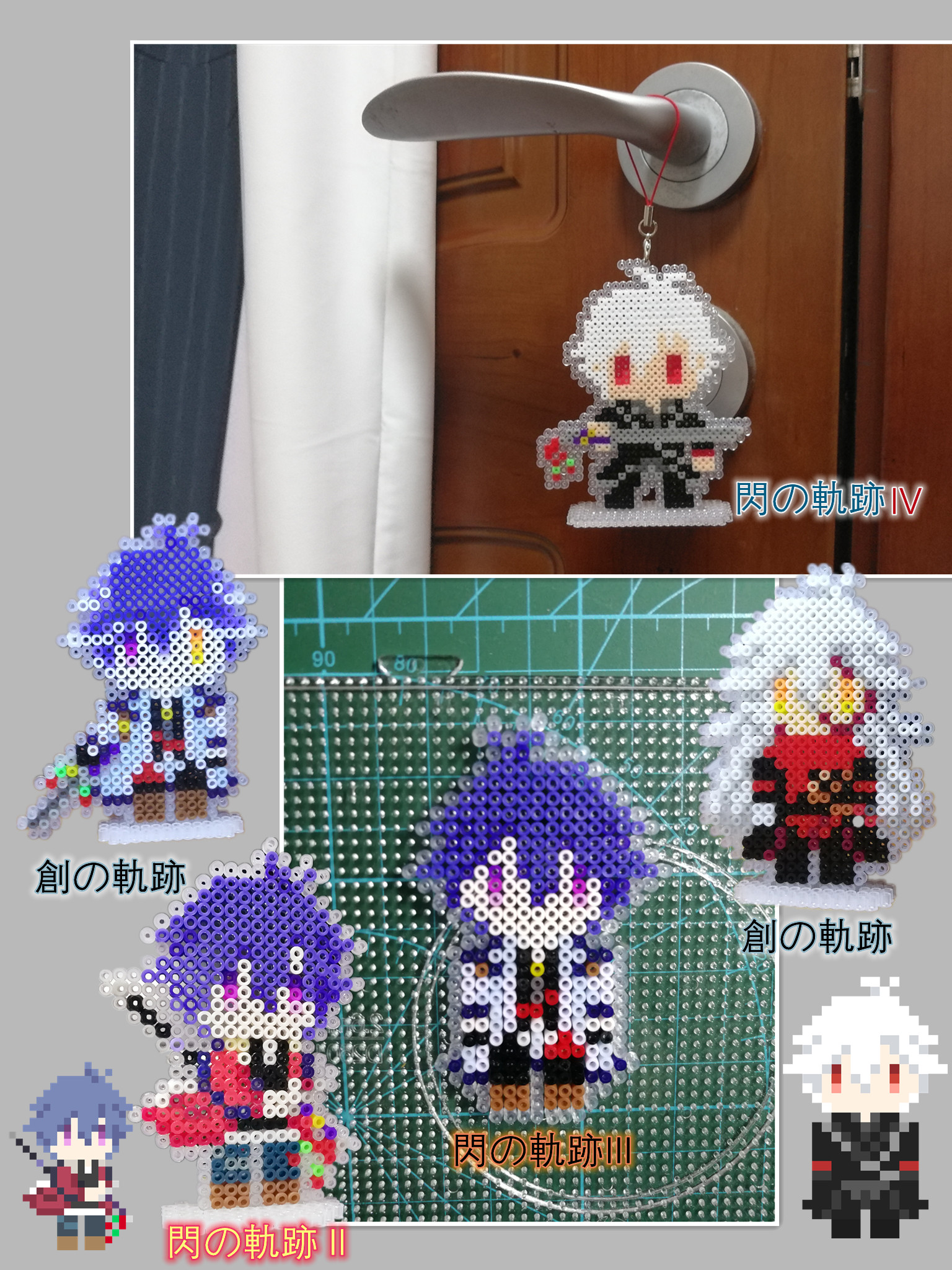 アイロンビーズで閃II・III・創のリィンくんとイシュメルガ=リィンを作ってみた。一番上のアイロンビーズはlimited baseのドットラバーストラップを参照しました、ほかは自分で描いたドット絵が元になっております。