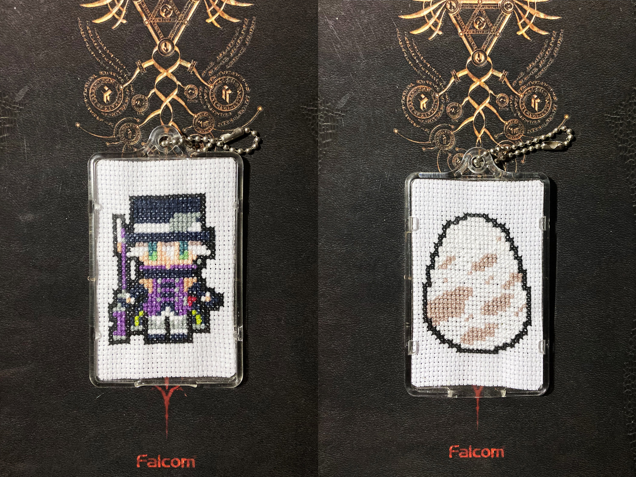 日本ファルコム様40周年おめでとうございます!表と裏にヒュンメルと卵を刺繍した。ヒュンメルが大好きでこれからイースシリーズに登場してほしいです!