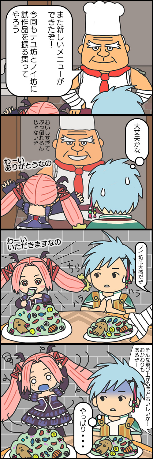 ノイが頭をかかえてぐるぐるする姿がかわいいので、それを描きたくてひらめいた4コマ作品。ゲームでもノイが先に食べてナユタが安全を確認してましたよね。さてナユタは食べることができるのでしょうか。