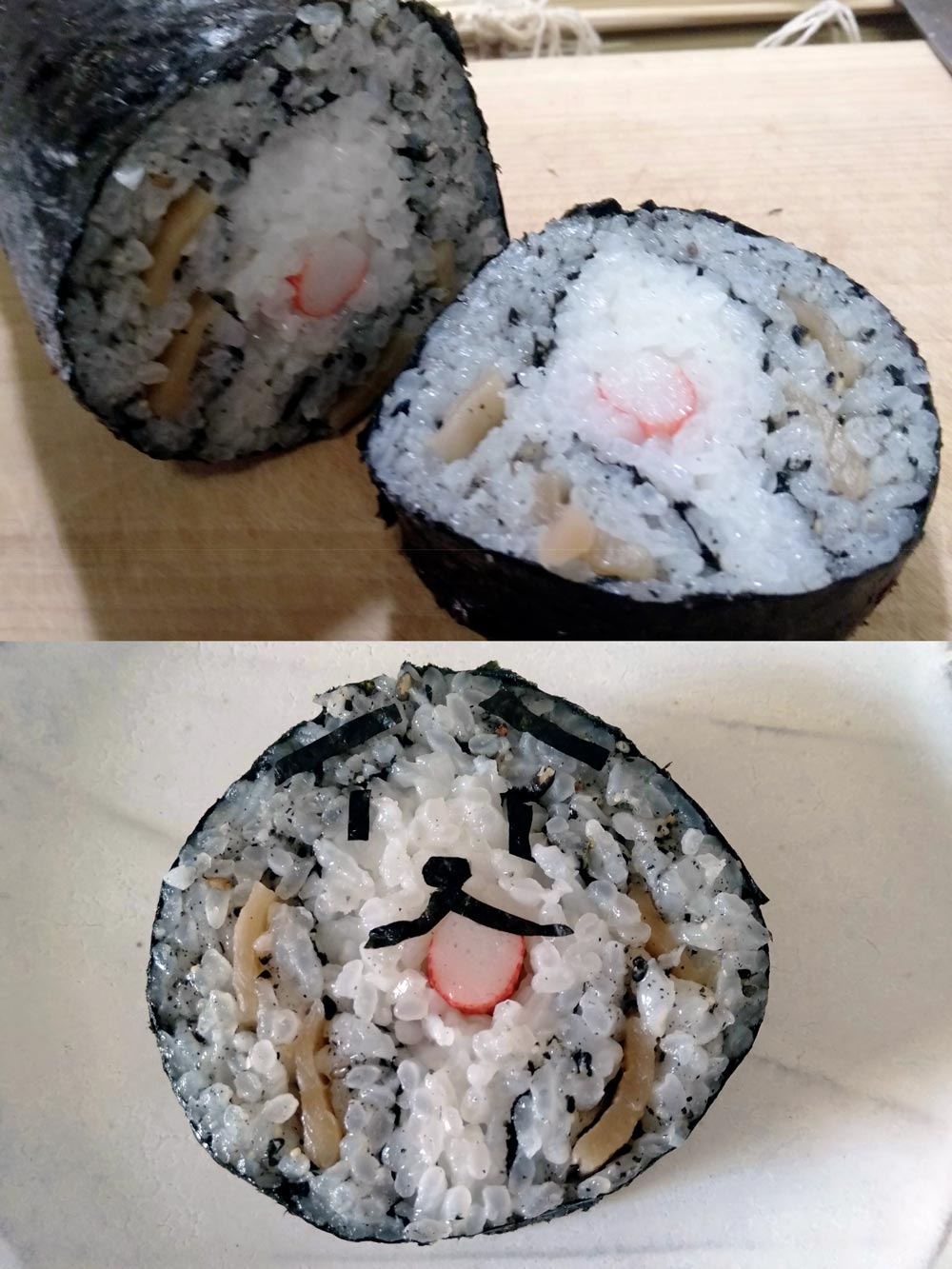 神経を使い苦労した割に完成図からかけ離れたものができました。ぐるぐる巻いたらおひげのかんぴょう巻きがぐるぐるねじれてどん底みっしぃになりました。これはこれでかわいいと思います!