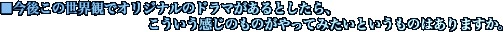 | 人間の力で何かを成し遂げていくんだということが強く感じられて、登場人物もとてもバラエティに富んでいる。そしてそれを実力派の声優が演じているということで、とても楽しみな作品だと思います。ドラマCD自体もすごく面白いし、ゲームも楽しみにしていただきたいなと思います。 |