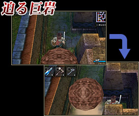 トラップを発動させるとアレスめがけて巨大な岩が転がってきます。轢かれてしまうと即ゲームオーバー。機転をきかせた素早い行動が必須!