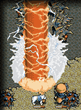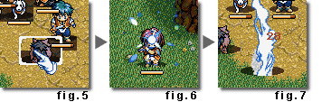 | (4) 選択されたコマンドをキャラが実行します(fig.6,7)。コマンドには、新たな命令を与えるまで使用し続けるもの、一回実行したらオート行動に移ってしまうもの、実行中に攻撃を受けると行動がキャンセルされてしまうものなど、様々な性質のものがあります。これにともない、常に緊張感のあるバラエティーに富んだ戦闘が楽しめます。