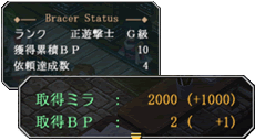 依頼をクリアすると報酬とブレイサーの経験値(BPブレイサーポイント)が入手できます。 BPがたまるとブレイサーとしてのランクが上がり、階級アップの報酬としてレアなアイテムが手に入ります。 様々な依頼をクリアし、一流ブレイサーを目指そう!