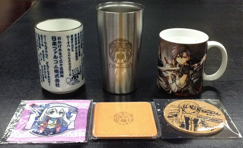 景品について 「ファルコム35周年記念ステンレスタンブラー+革コースター」または「ファルコム35周年記念湯呑+零の軌跡コースター」または「閃の軌跡IVマグカップ(非売品の一点モノ!)+アリサのコルクコースター」のどれかが当たります。どれが当たるか届くまでのお楽しみに。 |