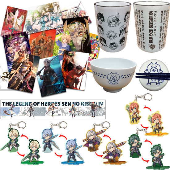 ▲絵はがきコレクションNo.001~041(各¥200)/閃の軌跡湯呑[全2種](各¥2,000)/閃の軌跡IVマフラータオル[リベール組](¥2,500)/閃の軌跡アクリルキーホルダー[5キャラ](各¥680)