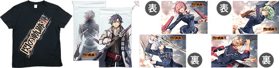 ▼閃の軌跡IIIロゴTシャツ[M](¥3,800)/閃の軌跡IIIマイクロファイバーポーチ(¥1,200)/閃の軌跡IIIA4クリアファイル[2種](各¥300)※すべて税抜価格