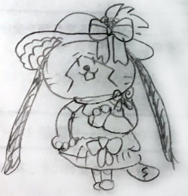 メモ帳の下書きでは口をカクカクにして、あとは手とかの節々を人形ちゃんを意識して描いてみたのですが、ちょっとかわいくないかもしれなかったので、本チャンでは、口も丸く、節々もやめました。