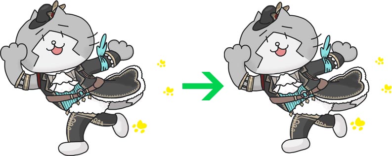 普段のゆるみっしぃはだいたい素っ裸ですし単純な動きしかしないのですが、白猫は超細やかな造りの衣装を着ていて且つ俊敏そうな感じだったので、どうしても足が長めになってしまいました。下の左のはだいぶ調整した後のですが、それでも長いのでさらに調整して動きがなくならないギリギリまで短足化させました。