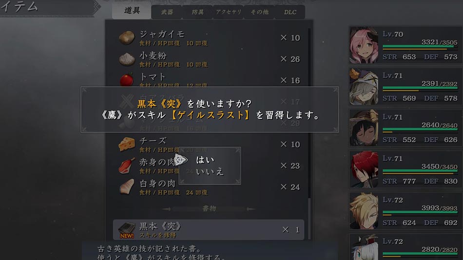 スキルは、ある一定のレベルの敵との戦闘中に閃いてGETできるものと、冒険中に入手できる「黒本」を使い習得するものがあります。ぜひ全てのスキルをGETしてレベルMAXを目指してくださいね。