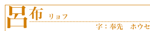 天下最強の武将。美女・貂蝉をめぐり義父の董卓と対立、暗殺に及ぶ。その後、董卓の残党勢力に追われ各地で転戦し、劉備を頼って徐州に落ち延びる。三龍の宝器の一つ「青龍剣」を所有する。