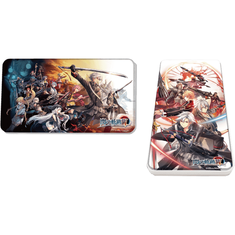 「閃の軌跡IV」のイラストが描かれたモバイルバッテリー。4000mAh(スマホ約2回分)の安心容量。カード型の本体で重量も110gと軽量なので持ち歩きも苦になりません。
