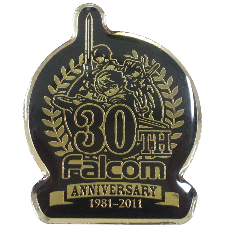 日本ファルコム30周年記念ロゴをモチーフとしたピンズ。特製ケースは30周年記念ロゴの箔押しです。