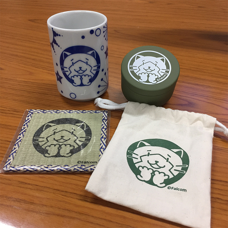 みっしぃのお茶缶、巾着、湯のみ、畳コースターのセットです。みっしぃのお茶でホッとひといきつきましょう♪