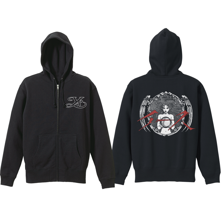 「イース1」の懐かしいドット絵のロゴと女神の姿を、落ち着いた色味でパーカーにプリント。ちょっと厚手の生地のパーカーは、アウターとしてはもちろん、冬場のインナーとしても活躍します。
