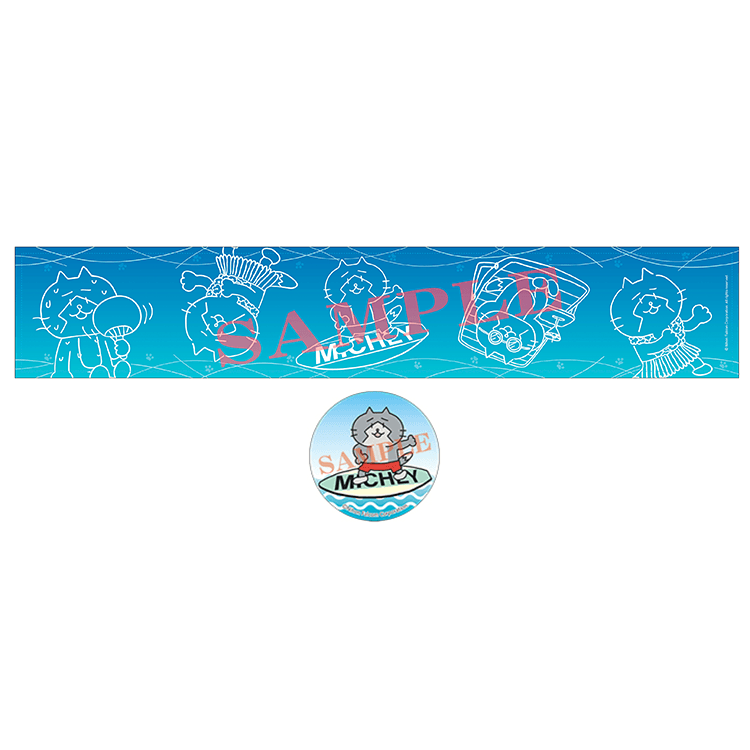 水に濡らして涼しいクールタオル!首や手、頭に巻いて暑い夏は大活躍!サーフィンみっしぃの缶バッジがセットになっています。
