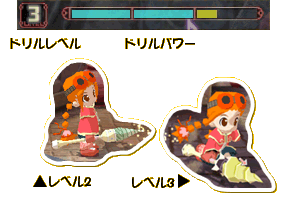 モノを壊すことでドリルパワーが溜まっていくよ。一定まで溜まるとドリルレベルがアップして、より攻撃力が増すんだ。ドリルパワーとドリルレベルは画面の上のほうに表示されているよ。