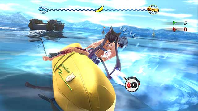 バナナボートから振り落とされないように左スティックでバランスを取りながら、水上のフラッグを入手してノルマを達成しよう!