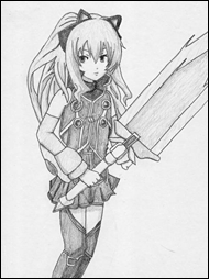 強力なアーツを組めることから後衛になりがちなティオですが、もしも「ビームザンバー」主体で闘えたら違和感なく前衛キャラになれるのではないかと思って描きました。エイオンシステムは装着した状態だと動き辛そうだったので思い切って外してみました。