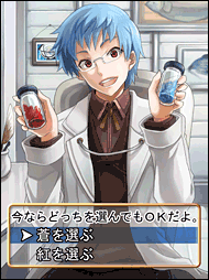 「ほら、僕が研究しているこの栄養剤。体が温まるし喉にも効果抜群なんだよ。良かったら試してみないかい?色は蒼と紅の2種類。今ならどっちを選んでもOKだよ」