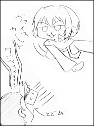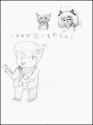 眼鏡の曇ったダドリーさんと、それを冷たい目で見るティオと笑うみっしぃを描きました。普段エリートキャラで通しているのでたぶんティオはあまりのギャップにひいてしまった感じだと思います。この絵は料理に失敗したダドリーさんを見て描こうと思いました。どんなドジキャラやねん 笑