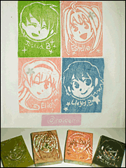 - いかさんに触発されての消しゴムハンコです!「ヒーローヒロインで向かい合わせ」がちっちゃなこだわりです。消しゴム本体の方はいろんな色を試している内に汚くなってしまいました…