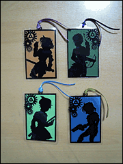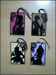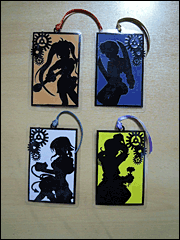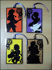 - 「朗読少女」コラボ記念(?)、空の軌跡メインキャラ16人分の栞です。切り絵をラミネート加工したもので、背景は髪の色、紐は瞳の色を基にしてみました。※一部光が反射していますが、枠と人物部分は黒一色です。