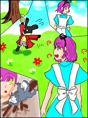 - おお!こちらも2枚目の世界ですね。レンのお茶会が開かれ、帽子屋の登場!カップには、ポムたちが顔をヒョコっとだしていてかわいいです。チェシャみっしぃがシマシマになっているのを発見し嬉しくなりました。楽しい2部作おなかいっぱい♪ありがとうございました!(いかより)