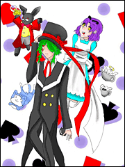 - 3枚目です!ギリギリになって、いかちゃんの1枚に複数キャラを描いていいって言う注意書きを発見したので、命がけで帽子屋カンパネルラを描いてみました!(いかちゃん本当にすみません!!!)