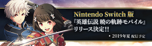 日本ファルコム株式会社(以下、「日本ファルコム」)は、USERJOY JAPAN株式会社がスマートフォン向けストーリーRPG作品『英雄伝説 暁の軌跡モバイル』のNintendo Switch版を発表したことをお知らせ致します。尚、日本国内でのサービス開始は2019年夏を予定しております。