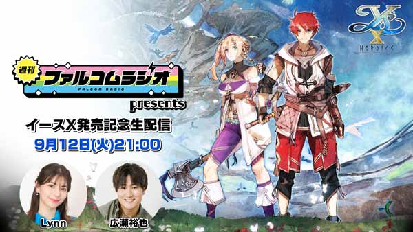 そして、なんと!!「イースX」の発売を記念し、来週9/12(火)YouTube生配信特番が決定しました!カージャ役のLynnさん、クルス役の広瀬裕也さん、リラ役の若山詩音さんが「イースX」の作品を紹介&プレイをお届け。番組視聴者へのスペシャルプレゼントも♪どうぞお楽しみに。