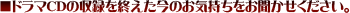 このドラマCDを聴くことができるのは、限定版を手にした方だけです(笑)。非常に期待を持ってこの作品を選んでいただいたのであれば幸いです。すごく楽しいキャラクターたちと一緒に冒険ができて、素敵な作品になっていると思いますので、ゲームの方も楽しんでいただければと思いますし、この作品がもっと広がっていければなと願っております。 |