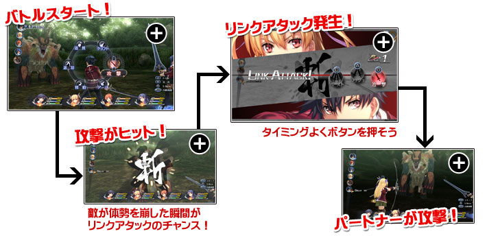 ≪VII組≫各メンバーの適性を踏まえ、新型戦術オーブメント『ARCUS(アークス)』に埋め込まれた機能。リンクで結びついたメンバー間で、戦闘中様々な能力が自動で発動。 ▼リンクアビリティ一例▼
