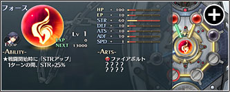 戦闘開始時に一定ターンSTRをアップさせるアビリティ「STRアップ」が発動する他、「ファイアボルト」などのアーツが使用可能になる。 |