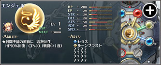 戦闘不能になる直前、HP(体力)とCP(クラフトポイント)が一度だけ回復するアビリティ「起死回生」が発動する他、「セラス」などのアーツが使用可能になる。 |