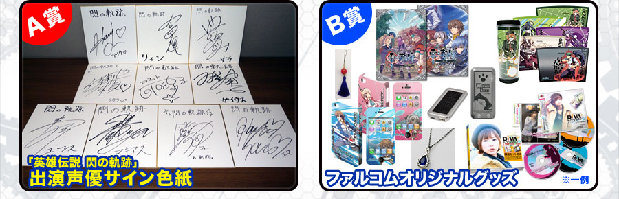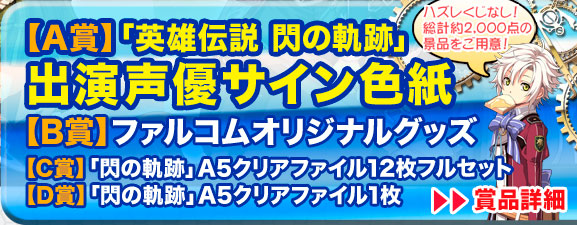 ※抽選会開催中に「英雄伝説 閃の軌跡」の予約証明ができるもの(レシート、予約券など)、または対象商品の購入証明ができるもの(レシート、領収書など)をお持ちいただいたお客様を対象に、スピードくじにてその場で景品をプレゼントいたします。