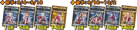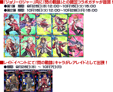 9/25(水)12:00~10/28(月)15:00の期間、「ジョリーロジャー」内に2種類の限定コラボガチャが登場。また、9/25(水)~10/7(月)の期間には「ジョリーロジャー」内のレイドイベントにて「閃の軌跡」に登場する「帝国解放戦線」のキャラクターたちがレアレイドとして出現!
