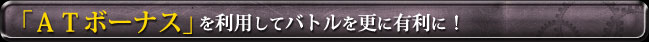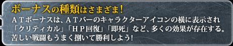 ATバーにはATボーナスがつくことがあり、ATボーナスのアイコンがついたキャラクターは、行動時に効果を受けられる。ATボーナスは敵キャラクターに対しても発揮されるので、行動順を常に意識し、ATボーナスを上手く利用して、戦闘を有利に進めよう。
