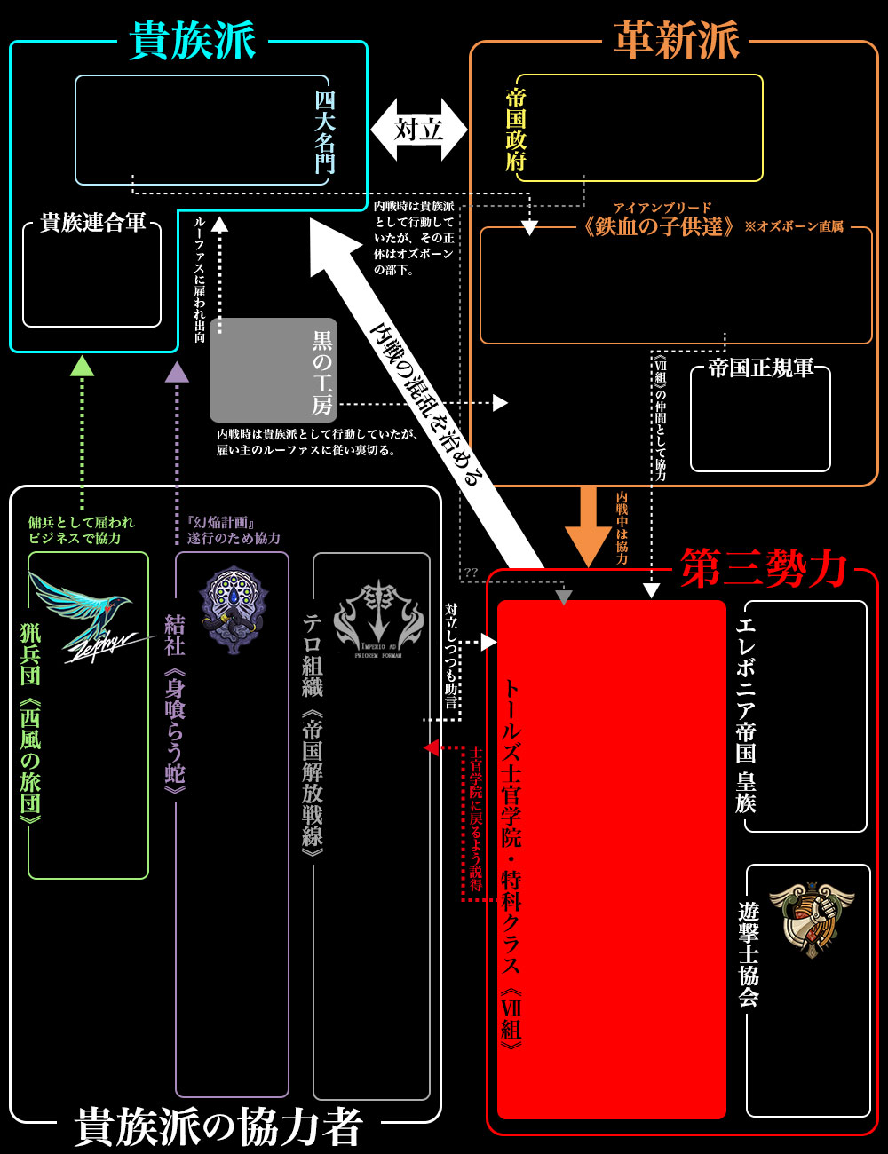 第三勢力が内戦の混乱を収めるが革新派の策により、リィンは内戦を救った帝国政府の《灰色の騎士》として扱われる。