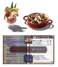 ■レシピ手帳 酒場・レストランでお勧め料理を食べたり、料理アイテムを使用したりすることでレシピが記録されます。レシピはSCで一新され、食欲をそそられるグラフィックが追加されました。 必要な食材が揃っていればレシピ手帳から料理を作成することができます。食材はショップで購入する他、魔獣から手に入れることができます。 料理にはHP回復の他、状態異常回復やステータスアップの効果があるものも!料理を上手く使って戦闘を有利に進めましょう!