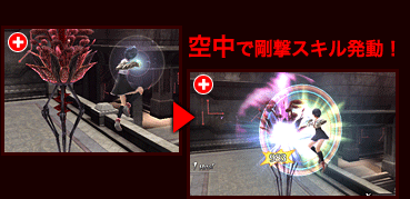 ジャンプ中、□ボタンを長押しして、空中でも剛撃スキルを発動させることができる。 |
