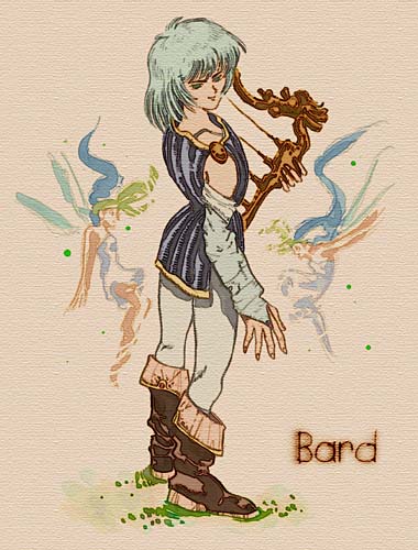 バード:希望の歌を紡ぎだす吟遊詩人。魔力・早さが高めですが、防御・魔法防御では劣っています。竪琴をかき鳴らし、高らかに唄う古の戦歌(いくさうた)は、敵の心身に衝撃をあたえます。 IMAGE ILLUSTRATION |
