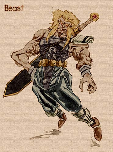 ビースト:孤高の魂をもつ半獣人。攻撃力に長け、防御・魔力は平均以上、しかも移動範囲が5あります。ただし最低ランクの魔法防御しかありません。背中に吊るした片刃の両手剣は、するどい切れ味を持っています。 IMAGE ILLUSTRATION |