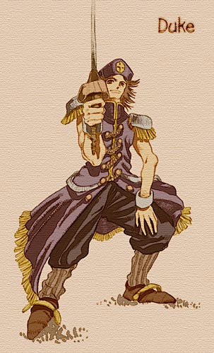デューク:野望に燃える若き公爵。攻撃・魔力・早さが高めでありながら、防御・魔法防御も悪くありません。移動範囲が3しかないのが弱点といえるでしょう。近寄ってくる敵を、細身の剣で貫きます。 IMAGE ILLUSTRATION |