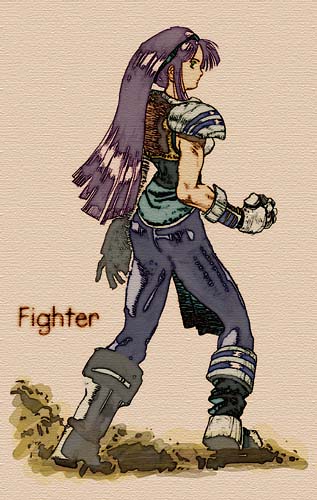 ファイター:強敵を求めさすらう女戦士。攻撃・防御が高く、身のこなしも素早いものがあります。かわりに魔力や魔法防御は低めです。宙に舞って放つ飛び蹴りは、相手にかなりのダメージをあたえるでしょう。 IMAGE ILLUSTRATION |