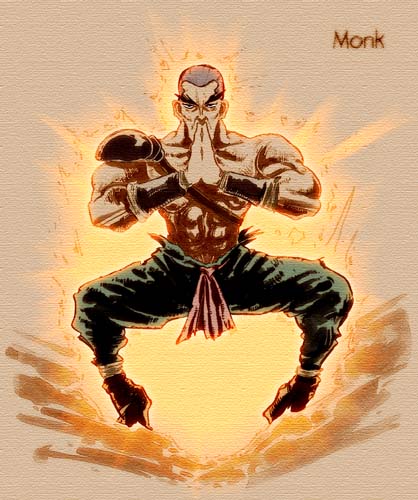モンク:武術をつうじて己を高める修行僧。攻撃・防御が平均を上回りながら、これといった弱点も見られない、非常にバランスのとれたマスターといえます。“気”を一点に集中し、相手に叩き込む“発勁”の使い手です。 IMAGE ILLUSTRATION |