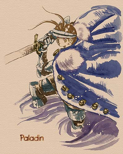 パラディン:闇を討ちはらう聖騎士。攻撃・防御・魔力・魔法防御のいずれにおいても高い能力を誇りますが、動きが遅いという欠点もあります。聖なる加護をうけたバスタードソードで、敵に強烈な斬撃を浴びせます。 IMAGE ILLUSTRATION |