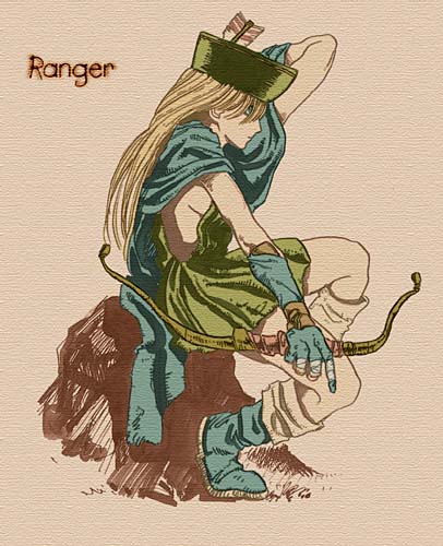 レンジャー:深き森の護人(まもりびと)。全てにおいて平均的な能力を備えています。これといった弱点がないのが最大の強みかもしれません。手にした長弓の射程は6、遠距離攻撃ができるマスターのなかでは最長です。 IMAGE ILLUSTRATION |