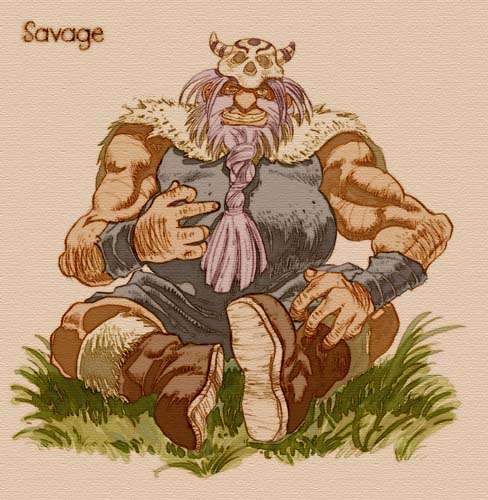 サベージ:復讐心に燃える猛き蛮人。マスターのなかでも、攻撃・防御・早さ・移動範囲において1、2を争います。そのかわり最弱の魔力しか持っていません。投げつける巨岩の射程は4、恐ろしいほどの破壊力を秘めています。 IMAGE ILLUSTRATION |