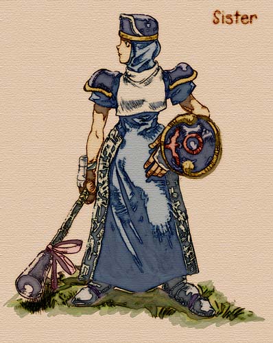 シスター:神に選ばれし清らかなる乙女。魔力・魔法防御に長けていながら防御もそれなりにあるマスターです。攻撃・早さが低いのが難点といえます。祝福を受けたメイスは信仰の証でしかなく、たいした威力は望めません。 IMAGE ILLUSTRATION |